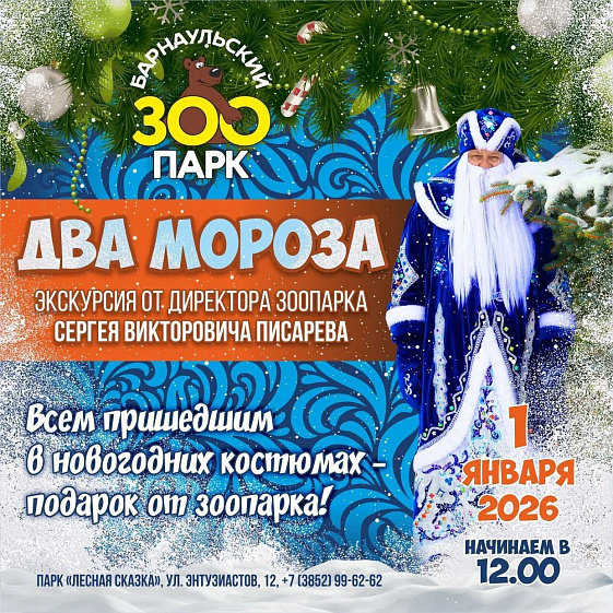 1 января 2026 года в 12:00 в барнаульском зоопарке пройдёт праздничная экскурсия. Её проведёт директор зоопарка Сергей Писарев. Горожане увидят показательные кормления и узнают эксклюзивные новости о планах на год. Помимо этого, посетители смогут лично задать вопросы руководителю.