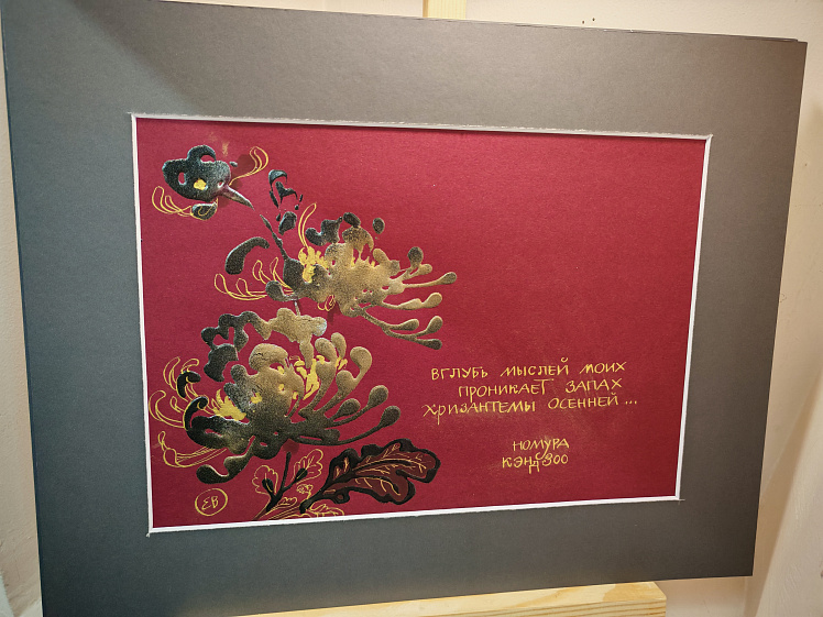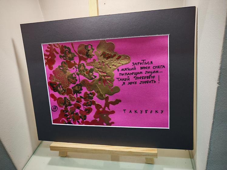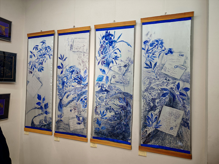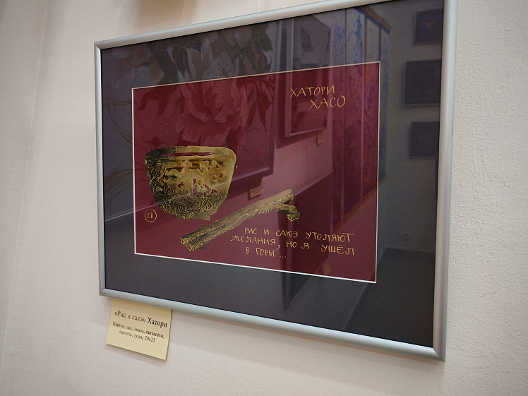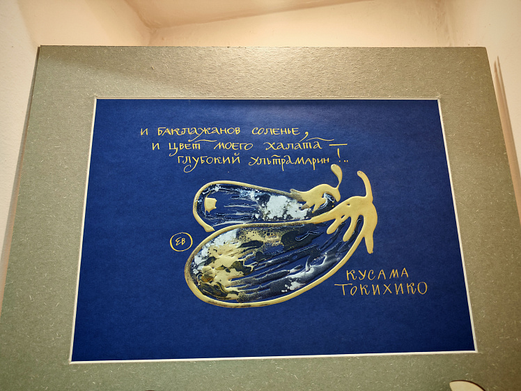 Все представленные на выставке работы можно объединить в серии. Так, графика выполнена на цветном картоне. Металлическим пигментом изображены цветы, овощи, силуэты людей, которые сопровождают хокку — трёхстрочные стихотворения японских авторов. Каждое из них можно расценивать как послание, заставляющее задуматься. Вот Татибана Акэми пишет: «Немного мне нужно: один понимающий друг для умной беседы да один пейзаж по соседству, чтобы только им любоваться…». Или Басё напоминает: «Жди лучших дней, но знай: в чистой душе слива цветёт и зимой…».