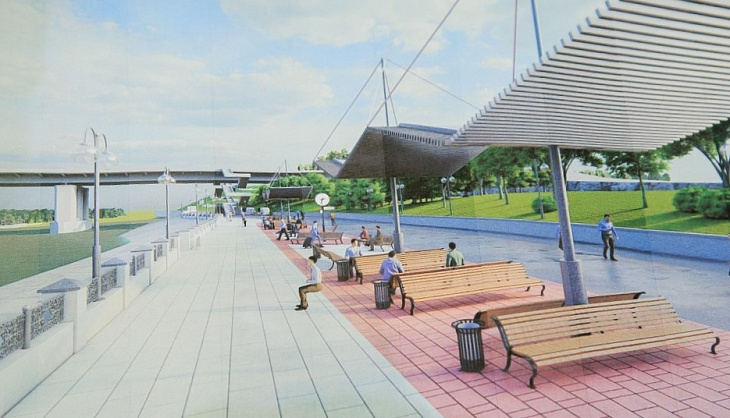 «Новый облик территории разработан в рамках концепции уже благоустроенной зоны набережной, — подчеркнул Дмитрий Суслов. — Планируется создать центральную прогулочную аллею, площадку для ожидания водного транспорта и транзитную зону. Будет полностью заменено дорожное покрытие, установлены скамейки, солнцезащитные навесы, освещение. Также здесь установят новое ограждение со стороны реки».