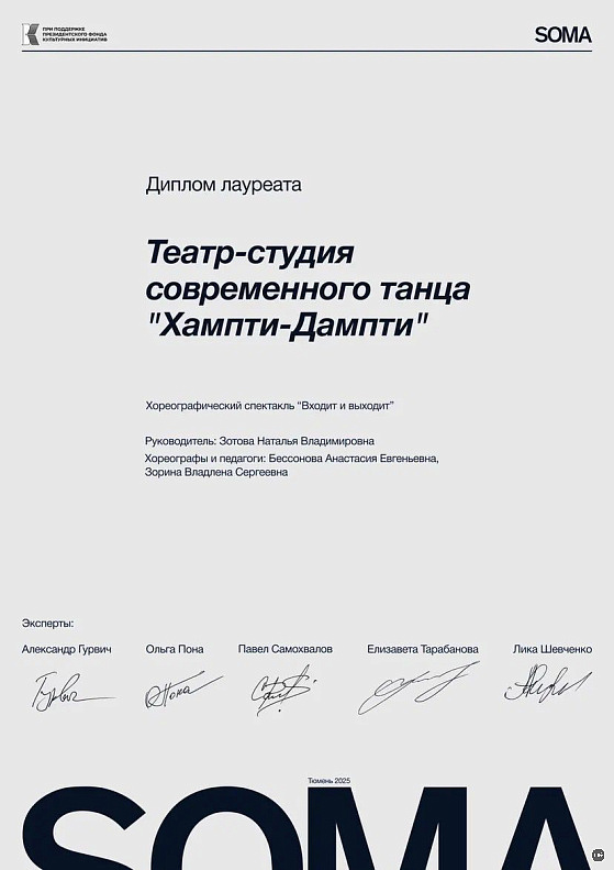 Фестиваль собрал в Тюмени 40 детских хореографических коллективов со всей России. По результатам выступлений члены жюри выбрали десять лучших постановок, и спектакль «Входит и выходит», который представил «Хампти-Дампти», стал одним из них.