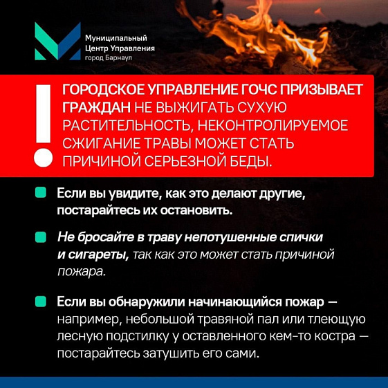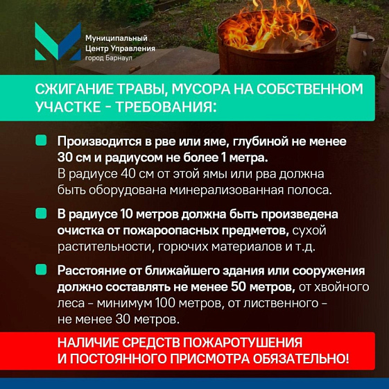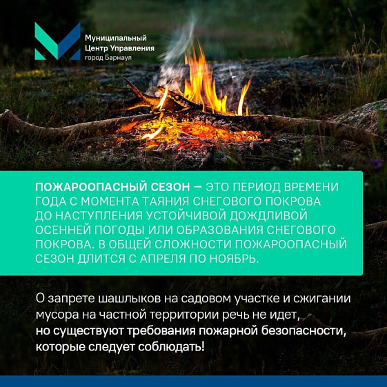 С 16 апреля 2026 года на всей территории Алтайского края действует пожароопасный сезон. В связи с этим жителей Барнаула призывают соблюдать правила безопасности в этот период.