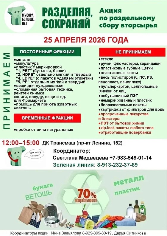 В субботу, 25 апреля, в Барнауле состоится экологическая акция по раздельному сбору отходов «Разделяя — сохраняй!». Её традиционно проводит НКО «Мусора.Больше.Нет» при поддержке комитета по благоустройству города Барнаула.