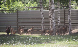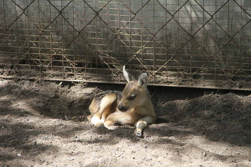 Два косулёнка (или как там назвать детей косули) пока ещё не играют — лежат себе в тенечке. Им и двух недель нет, совсем крохотные. А вот ребёнок северного оленя, может, и рад бы поиграть, да к нему не подпускает папа — закрывает от всех своими мощными рогами.