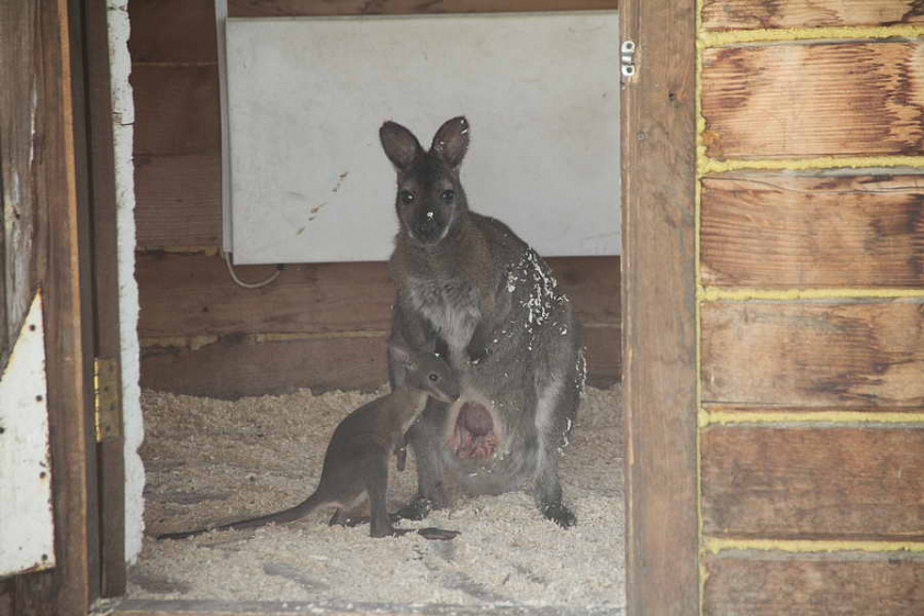 В конце марта пополнение произошло и в семье сурикатов. Причём, как говорят в самом зоопарке, такого здесь ещё никто не видел. А вот кенгурята уже рождались. Правда, если вы надеетесь на нынешнего малыша посмотреть, надо либо рассчитывать на удачу, либо запасаться терпением. В основном малыш проводит время в сумке своей мамы, изредка выглядывая на свет божий. Но нам повезло: мама так торопилась на прогулку, что ребёнок выпал из сумки, и удалось запечатлеть на фото редкий момент.