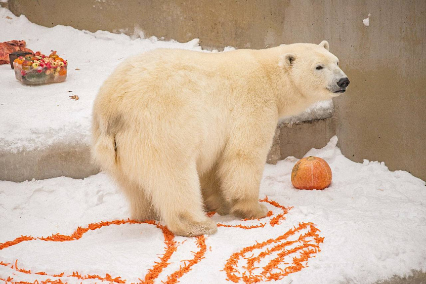 Ко дню рождения для медведиц приготовили угощения — их любимые лакомства, а также выложили поздравительную надпись из тёртой моркови и тыквы.