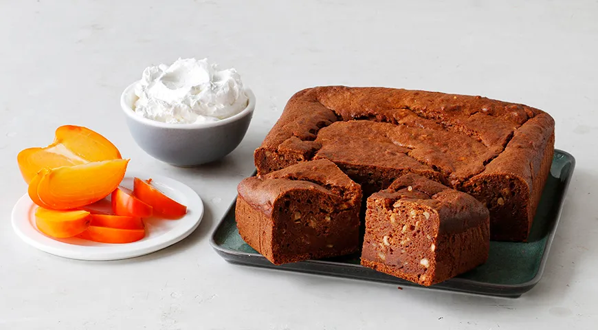 Как приготовить: разогрейте духовку до 150 °С. Слегка смажьте форму для выпечки растительным маслом. Смешайте муку, весь сахар, разрыхлитель, соду, соль, корицу, имбирь и мускатный орех в большой миске. Взбейте вместе яйца, молоко, сметану, цедру и ликёр (если используете) в другой миске. Добавляйте в молочную смесь порциями по очереди: мучную смесь и пюре из хурмы. В получившуюся массу добавьте нарезанные орехи. Перемешайте до однородности. Влейте за один раз всё растопленное сливочное масло. Перемешайте тесто до однородности. Переложите тесто в подготовленную форму для запекания. Выпекайте в разогретой духовке, пока смесь не подрумянится и деревянная палочка, вставленная в центр, не будет выходить чистой, 90–100 минут. Если нужно, последние 40 минут выпекайте, накрыв пирог фольгой. Подавайте пирог тёплым или выньте из формы и переложите на решётку, чтобы он полностью остыл. Нарежьте кусочками, каждый украсьте взбитыми сливками, припудрите корицей и декорируйте небольшими ломтиками (кубиками) хурмы.