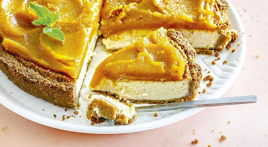 Требуется: для основы: 250 г песочного или овсяного печенья, 120 г сливочного масла; для начинки: 3 крупных яйца, 240 г йогурта, 50 г мёда, 1 ст. л. кукурузного крахмала, 2 ч. л. ванильного сахара; для пряной хурмы: 2 крупных плода хурмы, 250 г сахара, 4 г молотой корицы, 2 коробочки кардамона, 1 звёздочка бадьяна. Также можно использовать другие специи — мускатный орех, цедру апельсина или лимона.