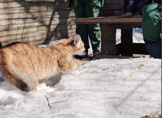 Саян принюхивался к насыщенному запахами весеннему воздуху, исследовал различные поверхности, забрался в снег и теперь готов принимать гостей. Малыш заметно подрос, обзавёлся красивой плотной шубкой переливчатого окраса — от платинового до тёмно-бежевого.