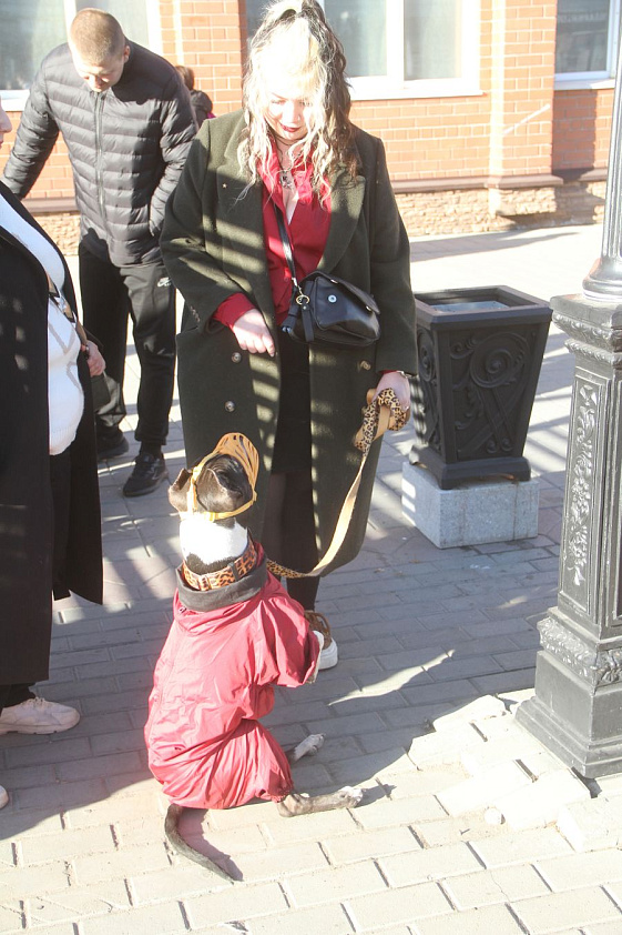 Ещё одна Виктория, Боровикова, пришла тоже с собакой бультипа — метисом стаффорда. Его кличка даже не особо подходит для такой грозной породы — Пряник. Был он в наморднике — для безопасности, и комбинезоне — для конкурса костюмов.