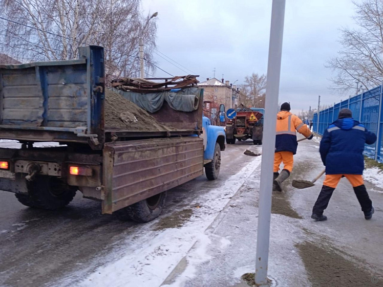 Из-за похолодания и обильных осадков в Барнауле наблюдается подмерзание поверхностей дорог и тротуаров. Дорожная служба посыпает улицы, чтобы обеспечить безопасность транспорта и пешеходов.