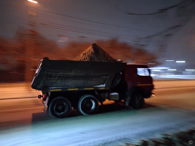 Снег вывозят в основном ночью. В это время дороги свободны от общественного транспорта и машин.