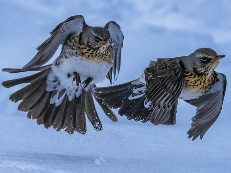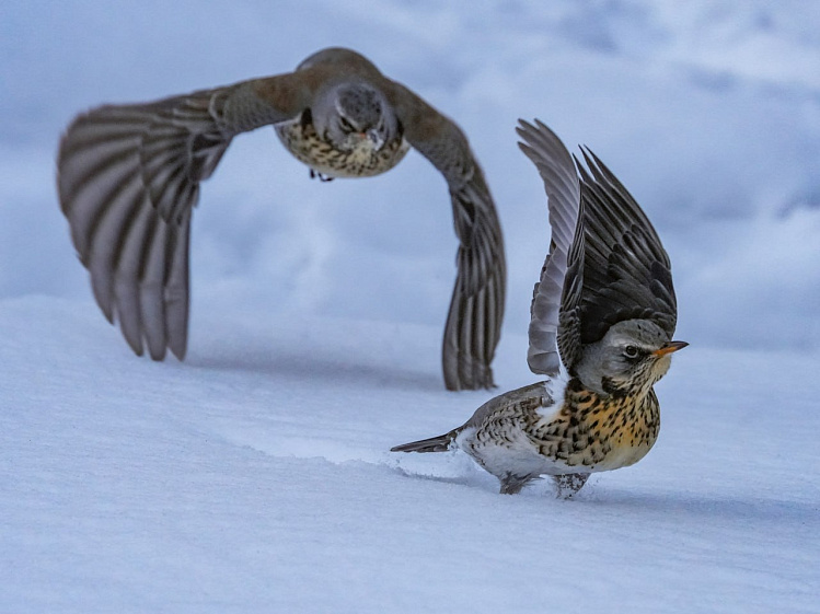 На берегах водоёма даже зимой кипит жизнь. Сотрудница алтайского заповедника Татьяна Воробьёва сфотографировала баталии за обед дроздов-рябинников.