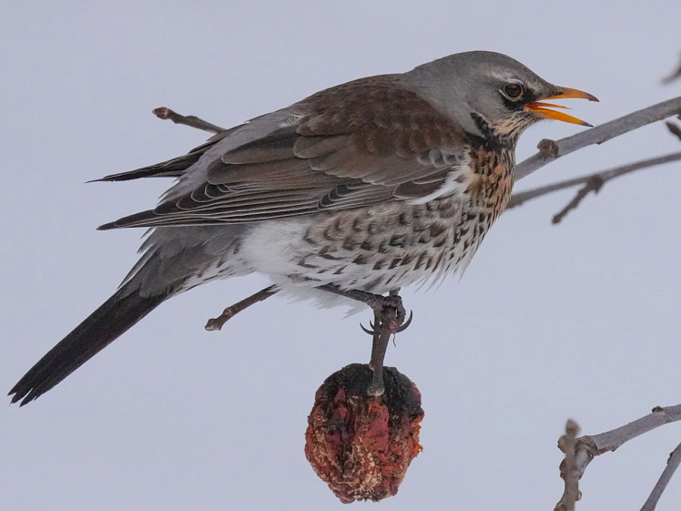 Мощный клюв рябинников позволяет им легко расправляться с плотной кожурой, добывая сочную мякоть. Чтобы полакомиться плодами, птицы затевают целые воздушные бои, отгоняя конкурентов от самых лакомых кусочков.