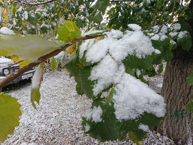 Кстати, 6 октября Барнаул тоже стал бело-зелёным. В краевой столице выпал мокрый снег, превративший деревья, траву и припаркованные машины в заснеженные объекты.