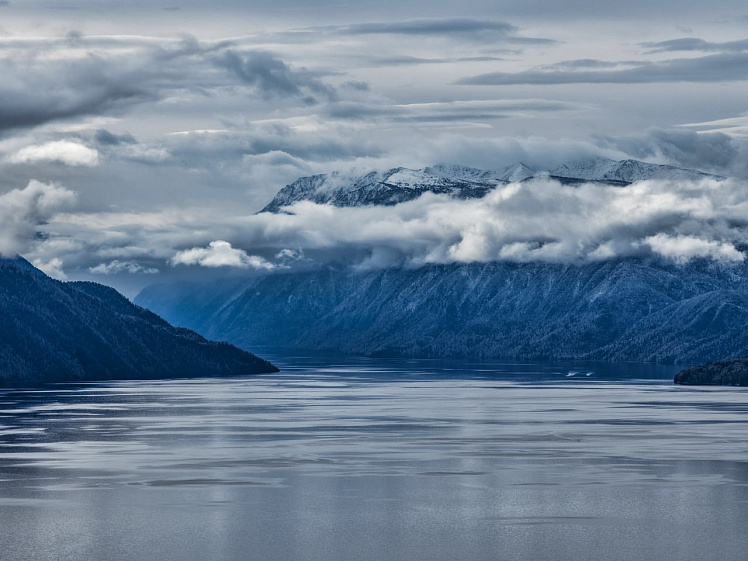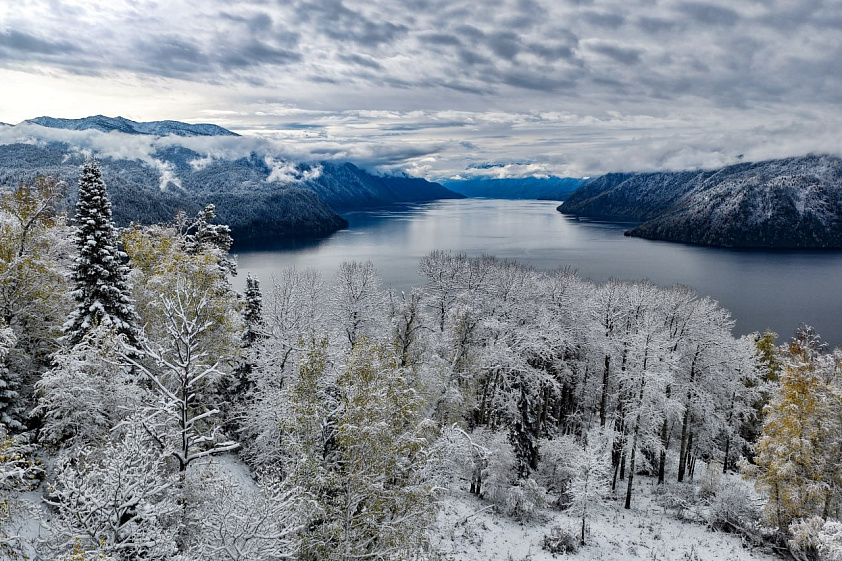 На побережье Телецкого озера короткая золотая осень сменилась зимними мотивами.