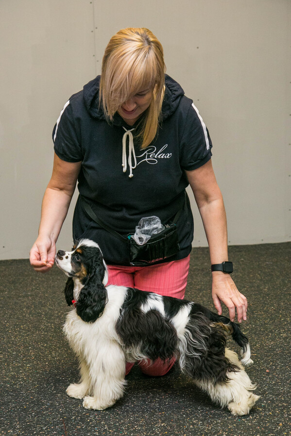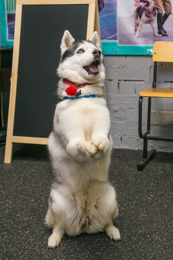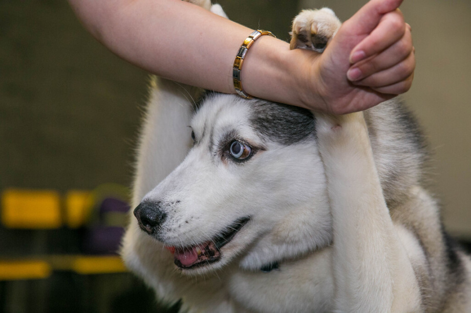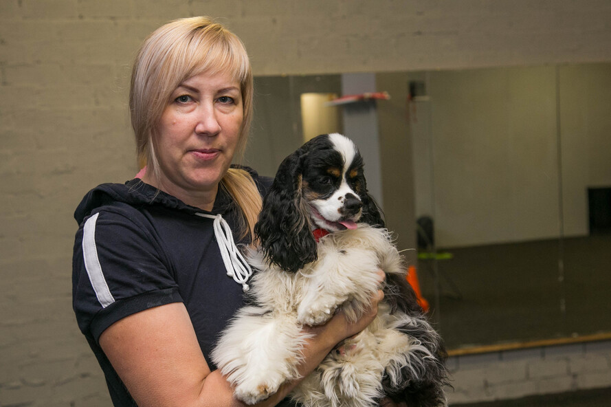 В зале консультационно-дрессировочного центра нас встретили сибирский хаски Айка со своей хозяйкой Ксенией Басок и американский кокер-спаниель Каталея с Еленой Авдюшкиной. Хвостатые спортсмены подошли к нам поздороваться, дали себя погладить и снова вернулись к занятиям.