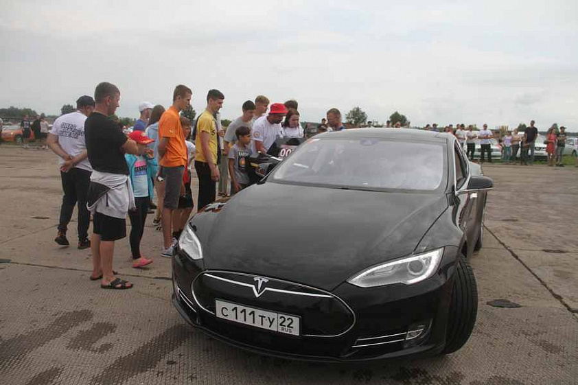 На этом фоне, пожалуй, в наибольшем выигрыше находятся те, чьи спорткары, да и не только спортивные, а просто кары «заряжены» от природы. Когда у тебя под капотом с завода 500 с лишним лошадиных сил и разгон до сотни укладывается в три-четыре секунды, что тут переделывать-то? А особенно если у тебя не машина, а чудо техники. Такой в выходные стала Tesla Евгения Ротанова. Автомобиль полностью на электротяге впервые участвовал в соревнованиях не только в Новороманове, но и, не исключено, в России. Ещё в прошлом году Евгений гонялся на Ауди А8-long, зимой приобрёл для души электромобиль.