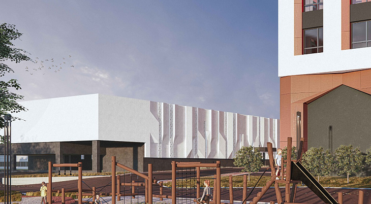 Фасады выполнят из композитных панелей, цоколь — из бетона и кирпича. Цветовая гамма в серо-белых тонах с коричневыми вертикальными акцентами по центральному и боковым фасадам. Ночная подсветка подчеркнёт основной объём, главный и дополнительные входы.