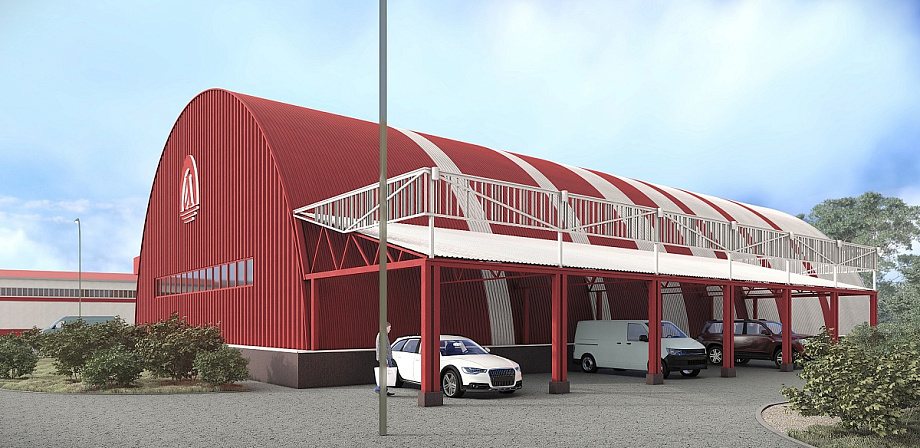 Гараж по плану ангарного типа, размер в осях 22 на 41,6 метра. Центральный объём запланирован с двумя входами и навесом для разгрузки и сортировки грузов. В основе строения стальной каркас на монолитном железобетонном основании. Выразительность фасаду придаёт использование градиента в шаге, созданного с помощью листовых материалов, а также яркие корпоративные цвета. Архитектурной подсветки у здания не будет, для освещения используются мачты.