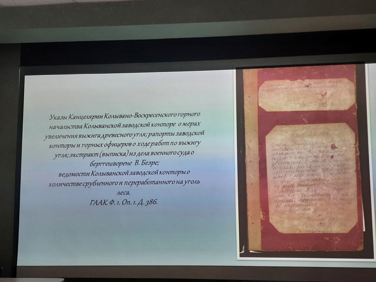 О документах подробно рассказала Дарья Полякова, начальник отдела использования и публикации документов. Среди них разрешение Берг-коллегии, выданное Акинфию Демидову на разработку месторождений меди в окрестностях Колывани, датированное 16 февраля 1726 года, от которого ведётся отсчёт истории горнозаводского производства на Алтае.