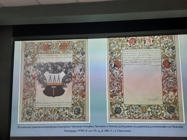 — Этим документом Екатерина I подтверждала Акинфию Демидову, его родным и их потомству дворянское достоинство, ранее пожалованное их отцу Никите Демидову. Грамота давала право пользования всеми вольностями и справедливостями, положенными дворянам. Но было существенное условие — говорилось, что их детей и потомков ни в какие другие службы не выбирать, кроме как в попечение вышеупомянутых заводов, так же и при искании медных и серебряных руд. Таким образом, все потомки Демидовых должны были заниматься именно заводским делом. Той же грамотой был утверждён герб рода Демидовых и дано его описание. И в заключение Екатерина указывала, «чтобы помянутых Демидовых и их законных наследников всегда в вечные времена за дворян держали, признавали и почитали», — дала пояснение к документу специалист архива.