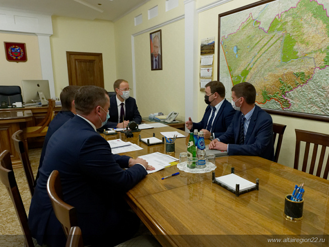 Андрей Водопьянов, руководитель концерна «Тракторные заводы» доложил Виктору Томенко о текущем положении дел на Алтайском моторостроительном заводе и представил Губернатору нового генерального директора АМЗ Александра Попова.