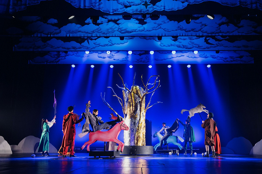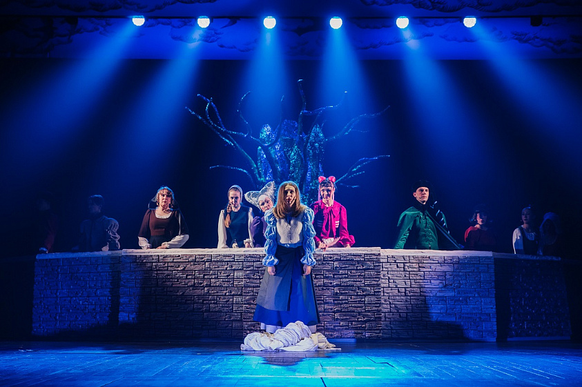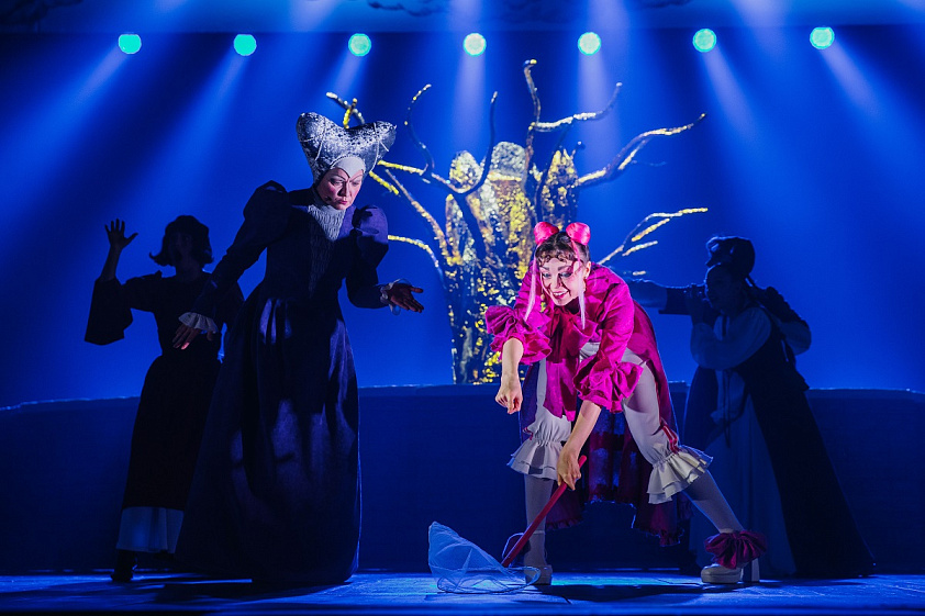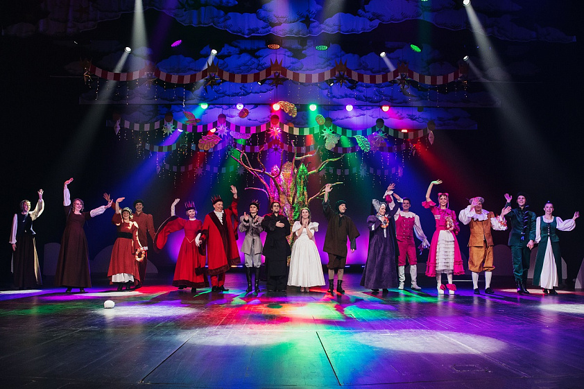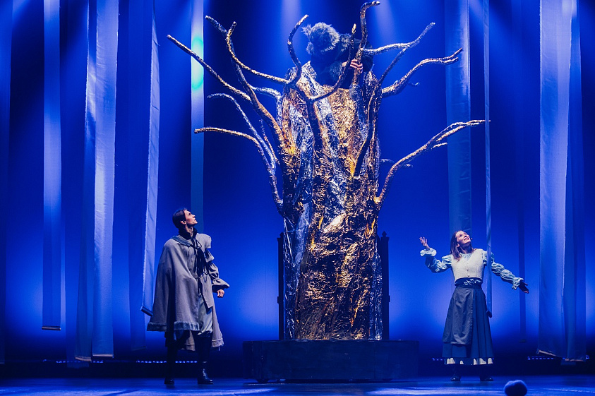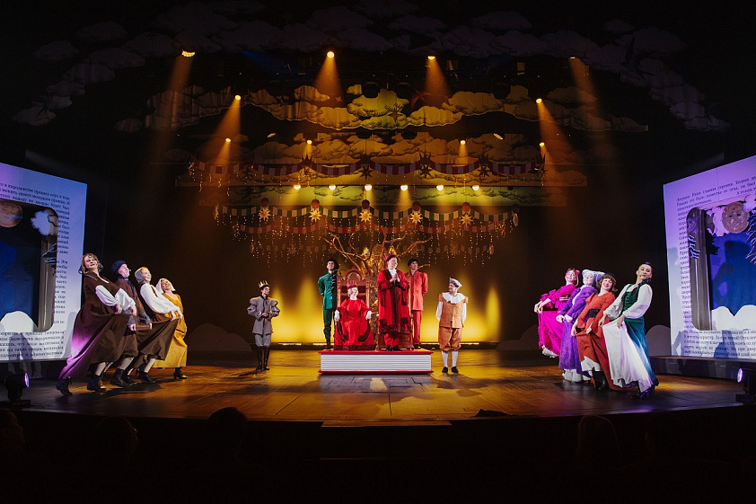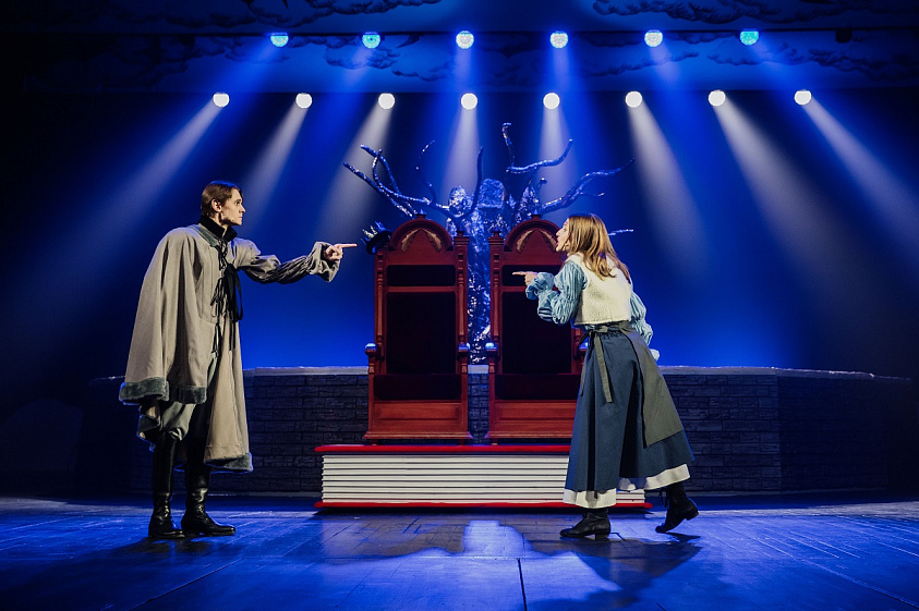 Сказочное пространство спектакля создано очень эффектно. Артём Терёхин вместе с художником-постановщиком Софьей Кобозевой придумали, что действие сказки происходит внутри книги, которая стоит на сцене.