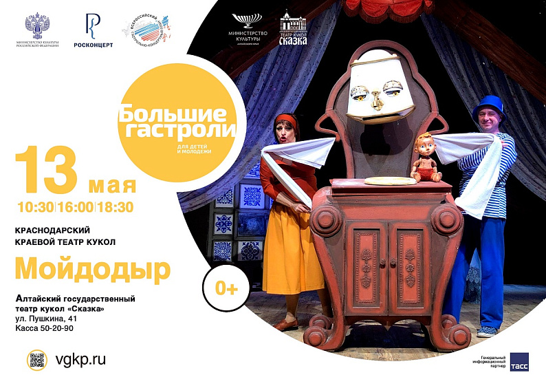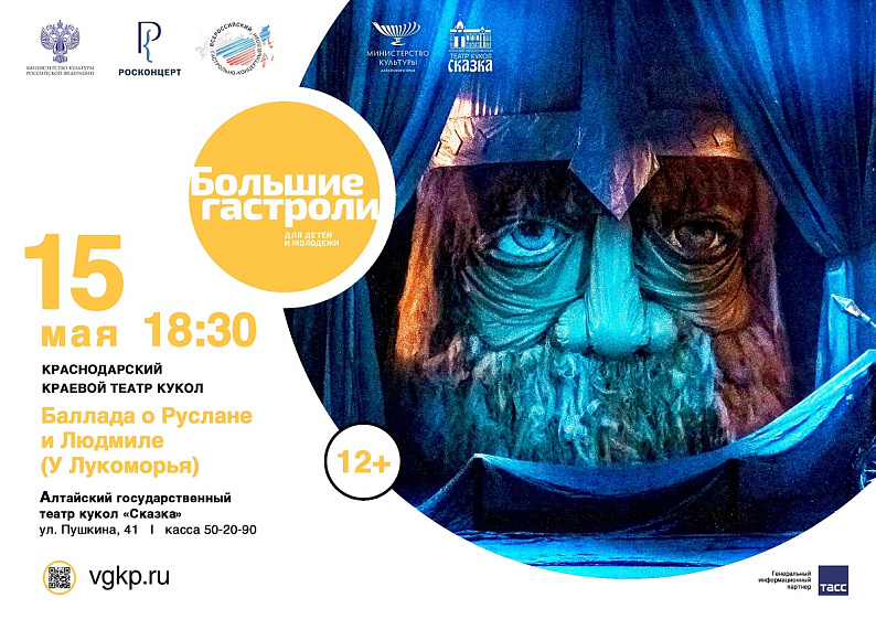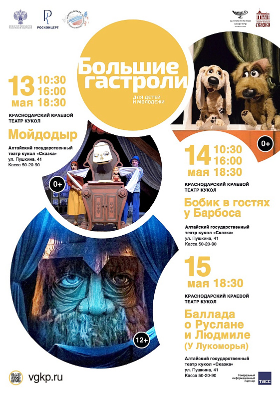 В рамках направления по поддержке детских и молодёжных театров кукольники Краснодарского края покажут барнаульцам спектакли «Мойдодыр» (0+), «Бобик в гостях у Барбоса», «Баллада о Руслане и Людмиле» («У Лукоморья») (12+).