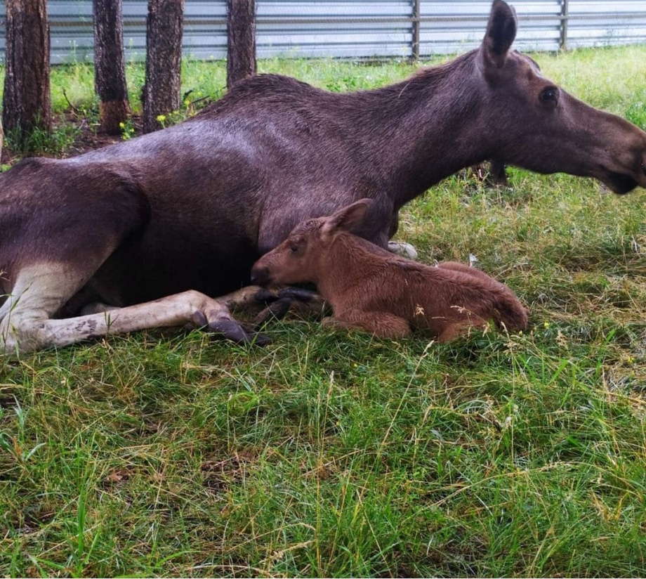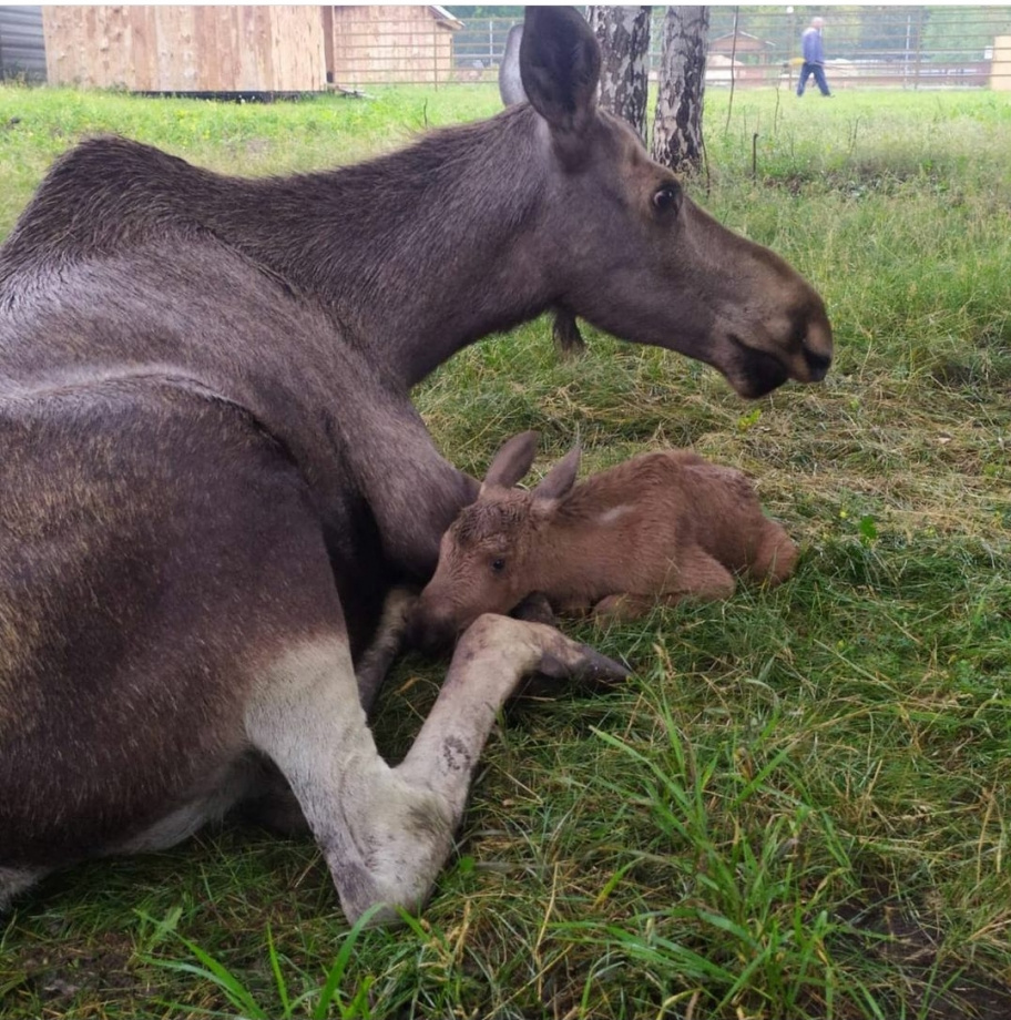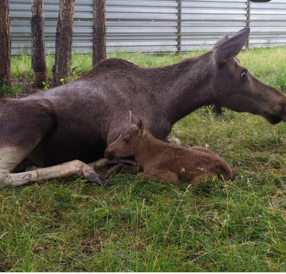 Мама с малышом чувствуют себя хорошо – отдыхают от трудов рождения на зелёной травке просторного вольера. Подписчики блога рассыпались в поздравлениях, сойдясь во мнениях, что крошка-лосяш – чудо как хорош!