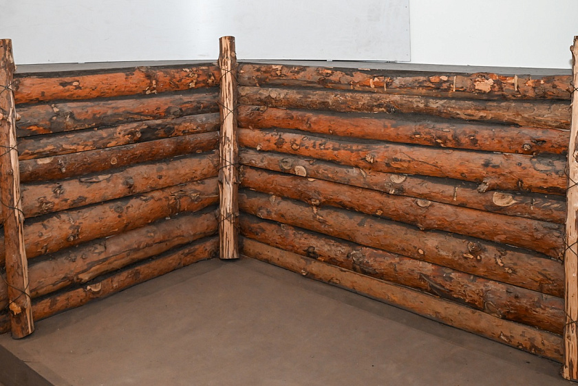 Первый зал получил условное название «Тыл». Здесь уже размещена инсталляция деревянной избы и настоящий заводской станок, который будет работать.
