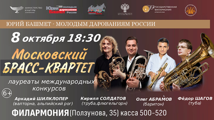 Зрителей ждёт не просто концерт, а встреча с новым звучанием медных духовых инструментов, где традиции и современность переплетаются в живом и насыщенном музыкальном диалоге, а каждый из участников квартета — самостоятельный голос в общем дыхании ансамбля, сообщает филармония. Возрастное ограничение 6+. Начало концерта в 18:30.