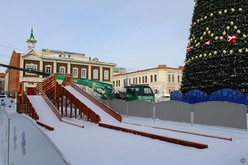 На территории будущего новогоднего городка сделали горку с выкатами. Чтобы гарантировать безопасность, рядом с ней будет организовано дежурство.