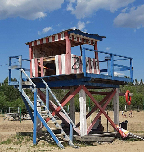 Фотографию разломанной и исписанной нецензурными словами конструкции, с которой спасатели следят за пляжем и отдыхающими, опубликовали в паблике «В Курсе 22».