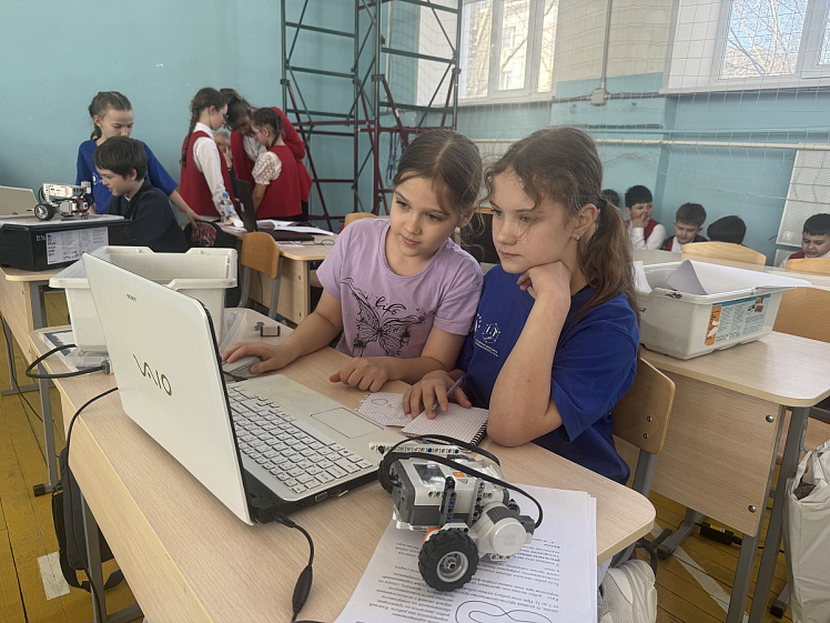 На олимпиаде школьницы в первом туре решали технические и математические задачи, например, нужно было высчитать диаметр колеса или посчитать площадь. Во втором они работают с роботом «Пятиминутка» (модель NXT), который принесли с собой. Робот подходит для среднего уровня и должен проехать по стрелке — без датчиков, просто по разметке. Его программируют с ноутбука: измеряют дистанцию, задают программу, запускают и проверяют — из-за погрешностей действия приходится повторять несколько раз.