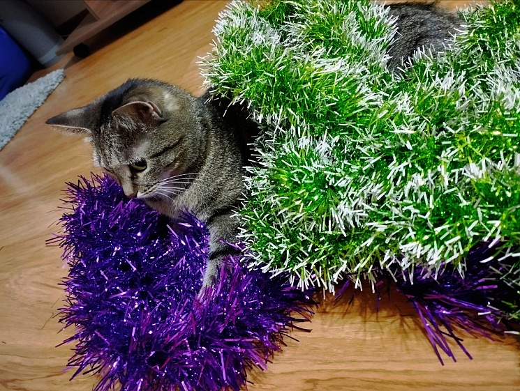 От новогоднего дождя вовсе стоит отказаться. Если животное проглотит его, это может привести к непроходимости кишечника, отравлению токсичными веществами, содержащимися в изделии, механическим повреждениям полости рта и внутренних органов.