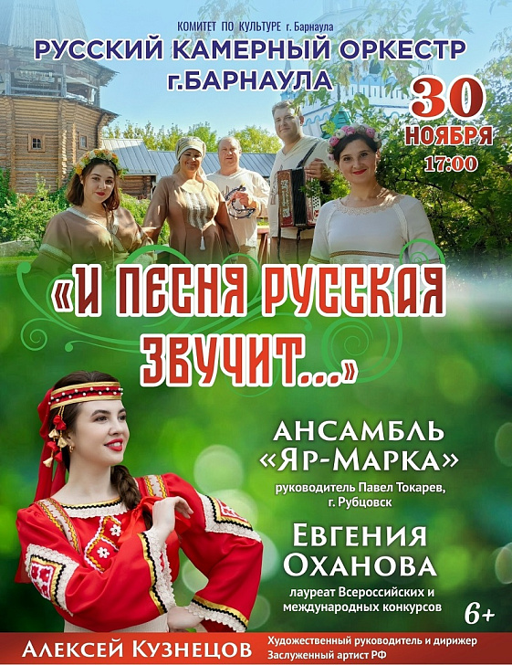 30 ноября в зале на пр. Комсомольский, 108а также состоится концерт «И песня русская звучит…» Русского камерного оркестра с участием ансамбля «Яр-Марка». В программе прозвучат разножанровые и разнохарактерные произведения — народные, плясовые, лирические и шуточные. Дополнительная информация по телефону: 24-87-44. Начало концерта в 17:00. Возрастное ограничение 6+.