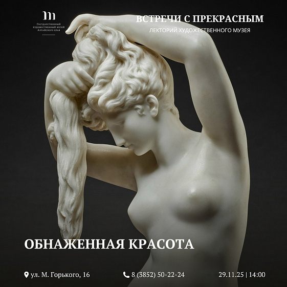 В Государственном художественном музее Алтайского края (ул. Максима Горького, 16) 29 ноября в 14:00 пройдёт лекция «Обнажённая красота» в рамках лектория «Встречи с прекрасным».Заведующая сектором выставок научно-просветительского отдела Светлана Артюхова расскажет об обнажённой натуре в истории развития скульптуры. Лекция поможет проследить, как менялось отношение к скульптуре от «палеолитических Венер» до «Поцелуя» Огюста Родена; подскажет, что держала Венера Милосская в руках и какое отношение имеет остров Милос к скульптуре; покажет, какое отношение скульптура «Тираноборцы» III века до нашей эры имеет к скульптурной группе Веры Мухиной «Рабочий и колхозница»; объяснит, почему «Ника Самофракийская» считается одним из самых значительных произведений искусства эллинистического периода и куда подевалась одежда античных скульптур. Возрастное ограничение 12+.