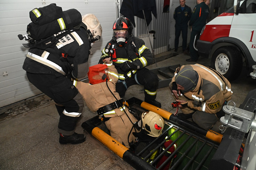 Сегодня командир отделения проводит тренировку с личным составом своего звена — газодымозащитниками, то есть людьми, включенными в дыхательные аппараты со сжатым воздухом. Пространство тренировки по-настоящему не задымлено. Чтобы имитировать плохую видимость, пожарные заклеивают маски малярным скотчем. Им нужно пройти по длинному узкому коридору, найти пострадавшего и эвакуировать его. В роли коридора — смотровая яма для пожарной машины длиной около десяти метров. Трое спасателей наощупь подключают пострадавшего к одному из своих баллонов и выносят наверх, параллельно переговариваясь друг с другом и с базой — командиром, который наблюдает за ними сверху, чтобы потом провести разбор успехов и ошибок.