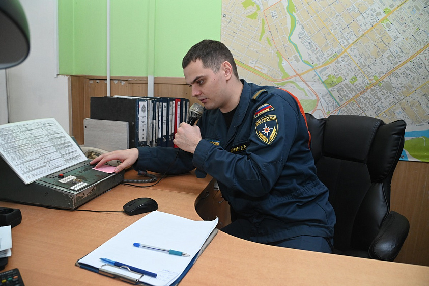 На третьем этаже — центральный пункт пожарной связи, туда приходят сообщения со всего города, а оттуда сведения кратко передают диспетчеру части. Начальник караула, капитан внутренней службы Александр Вяль объясняет: