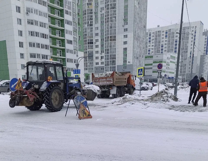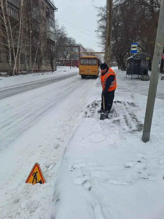 Снег сегодня вывозят вблизи остановок, павильонов и подходов к пешеходным переходам на улицах Калинина, Профинтерна, Монтажников, Взлётной и других.