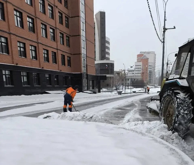 Зимнее содержание проезжих частей и пешеходных дорожек проводится во всех районах Барнаула. В этих работах 23 февраля 2026 года заняты 90 человек и 91 единица спецтехники.