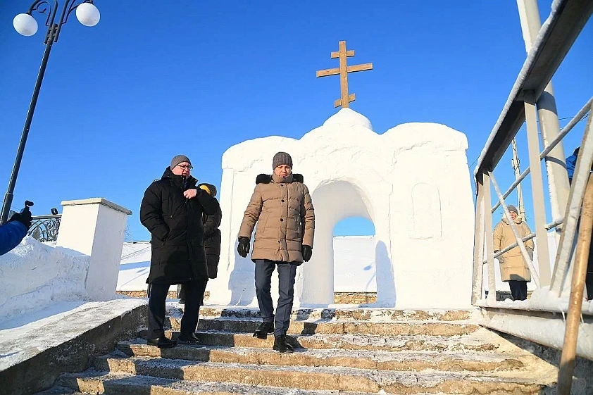 На территории купели на реке Обь специалисты «Барнаулгорсвета» установили временное освещение. Работники «Благоустройства и озеленения» вместе с подрядчиками возвели снежную часовню и мостки для удобного подхода к воде. Сейчас продолжаются работы по обустройству купели и ледяного креста.