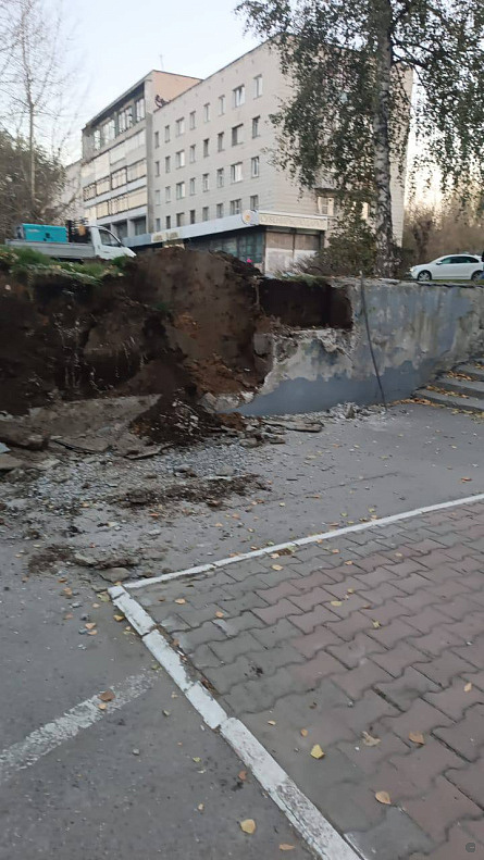 Потенциально опасные подпорки у здания №135а на проспекте Красноармейском начали ремонтировать в Барнауле. Работы идут по обе стороны дома.