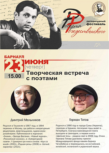 С публикой будут рады увидеться Герман Титов (Сумы — Санкт-Петербург) и Дмитрий Мельников (Ташкент — Москва). Стихи Германа Титова удостоены премии Международного фонда памяти Бориса Чичибабина и переводились на английский, китайский, испанский и украинский языки. У Дмитрия Мельникова вышло три книги стихов, его называют поэтом невероятного диапазона и невероятной для нашего времени красоты речи.