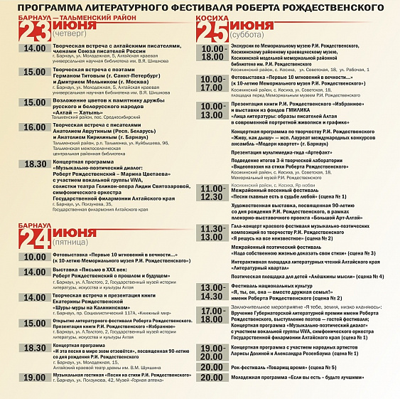 В 2022 году исполняется 90 лет со дня рождения выдающегося поэта, уроженца села Косиха Алтайского края Роберта Рождественского. Центральным событием, посвящённым юбилею, станет Литературный фестиваль Роберта Рождественского, который пройдёт с 23 по 25 июня. 23 июня в рамках Литературного фестиваля Роберта Рождественского в библиотеке им. В. Я. Шишкова состоится встреча с современными российскими поэтами.