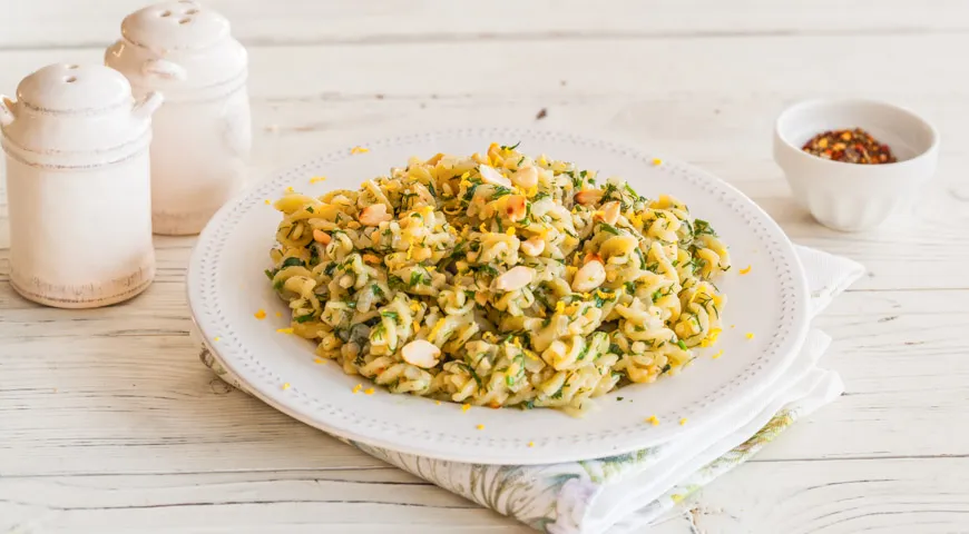 Как приготовить: для зелёного рагу очистите и мелко нарежьте лук, измельчите зелень. С лимона снимите цедру, из мякоти выжмите сок. Орехи порубите ножом. Разогрейте в сковороде 2 ст. л. оливкового масла и обжарьте в нём лук до мягкости. Добавьте 0,5 стакана воды, цедру лимона и готовьте ещё 3 минуты. Не убавляя огонь, положите в сковороду мелко нарезанную зелень, перемешайте и готовьте 2 минуты. Снимите сковороду с огня, добавьте 3 ст. л. масла, 2 ст. л. лимонного сока, орехи. Посолите, поперчите по вкусу. Отварите макароны согласно инструкции на упаковке. Откиньте на дуршлаг, выложите на блюдо и заправьте зелёным рагу.