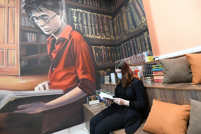 В пространстве для подростков все стены заставлены книгами, причём часть полок нарисована: в окружении толстых фолиантов на одной из стен сидит и читает мальчик, очень похожий на Гарри Поттера. Как признаётся директор библиотеки, изначальной идеей было сделать здесь классическое лофт-пространство, с имитацией кирпичной кладки и стекла. Но потом решили оформить эту комнату в стилистике одной из самых популярных подростковых книжных серий.