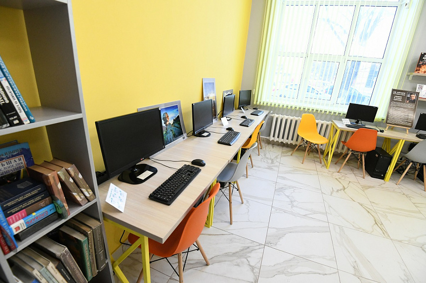 Обновился медиазал. Теперь здесь 12 компьютеров, на которых доступны интерактивные игры для проверки своих знаний. На игровом автомате «Игрёнок» для разных возрастных групп установлены раскраски, кроссворды, викторины, ребусы, игры на логику. «Игрёнок» в библиотеке с 2018 года, и новую цветовую гамму медиазала подбирали под него. Часто, пока мамы выбирают книги, детишки играют здесь.