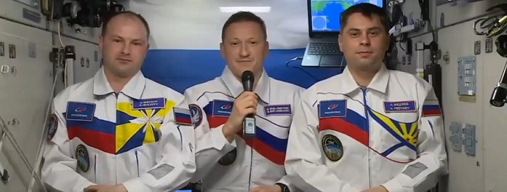 Сотрудники «Роскосмоса» Сергей Кудь-Сверчков, Сергей Микаев и Андрей Федяев с борта Международной космической станции (МКС) обратились к россиянам с приветствием. Видео опубликовано в канале агентства в мессенджере МАКС.