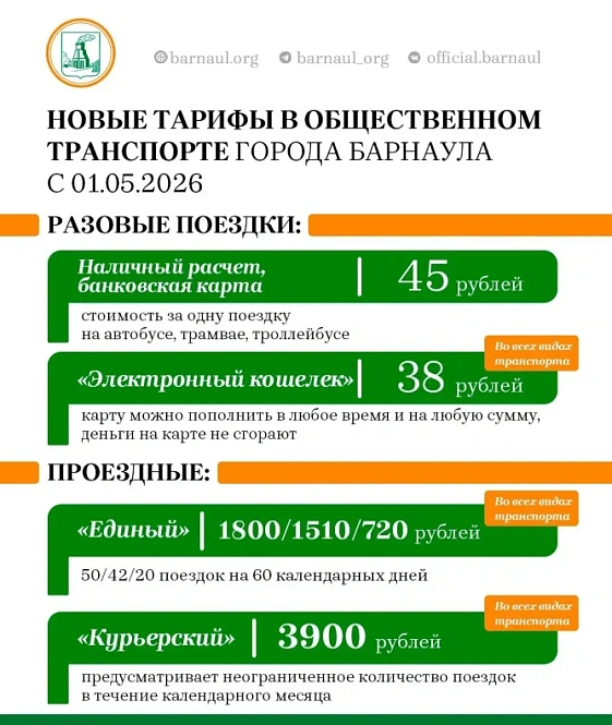 45 рублей за наличный расчёт будет стоить проезд в общественном транспорте с 1 мая 2026 года в Барнауле. По общегражданским картам горожане смогут проехать за 36–38 рублей, а школьники, студенты и пенсионеры — за 14–21 рубль.